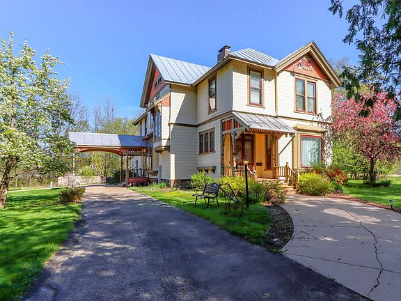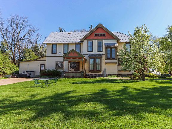 This gorgeous Victorian Farmhouse in the heart of Waupaca offers 5BR+ 6BA+ over 3350 sq.ft. of updated living space. Beautiful & Bright with so much to offer. Living room with cozy wood burning Fireplace, large formal dining room, covered porch and so much more! All spacious Bedrooms have full bathrooms en-suite. Currently operated as a B&B so private inn-keepers quarters offers a flexible additional living space with separate entry allowing for endless options- Home business with Commercial zoning. The historic Crystal River Inn property sits on 7 picturesque acres along 400+ft. of frontage on the Crystal River. Includes Carriage House, Garage & Chicken Coop, Gardens, Orchard and so much more! Available fully furnished, move in ready!
