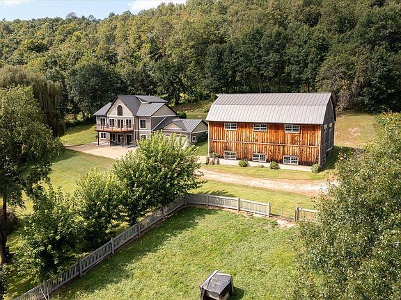 Experience refined country living on 24 serene acres! This private estate features a stunning 3BR, 3BA modern Craftsman home with 3,400 sq ft of luxurious space, with Amish-built maple cabinetry, soapstone & butcher block counters, huge pantry, & accessibility-focused lower level stubbed for 2nd kitchen or wet bar. Enjoy tranquil wooded trails or relax on the hill with a quiet fire on a cool fall night. The 40x64 pole building gives space for all the toys & a 2-story barn, plumbing ready is ideal for guest house or retreat. A fenced paddock, insulated mini barn/chicken coop with electric await your animal friends. Smart Siding, standing seam steel roof, LVP floors & rich hardwoods offer timeless quality. Wooded trail leading to secluded campfire area. Trout stream just across the road!
