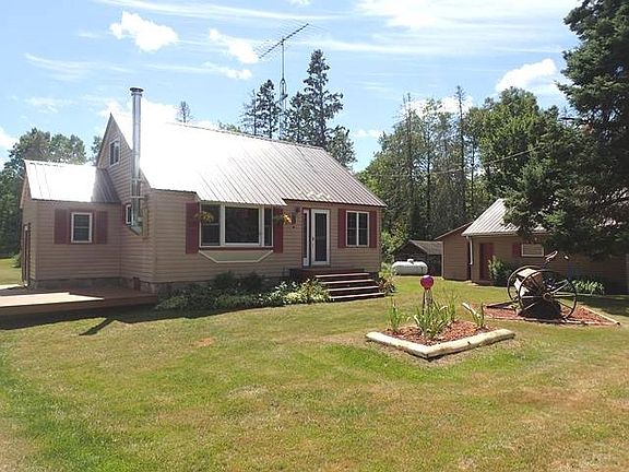 Escape to the Peaceful outdoors! This 3+ bedroom country home sits on over 7 acres with 4 car insulated and heated (32'x40') garage, a second garage for storage with an old sauna on the back and an old-loggers cabin that would be adorable restored! Main level has two bedrooms, nice size bright living room with a bay window and propane stove, eat in kitchen with windows overlooking the bluff behind & the full bath with a walk-in shower. 2nd level features another bedroom and either a bonus/office room or walk-thru bedroom. Enjoy the walking trail for your evening stroll, or relax on the multi-level decks. This home has been updated to include: newer furnace, windows, siding & roof and includes all the appliances! Every window offers a view of the beautiful UP northwoods! This home is move-in ready, just waiting for its new family!!