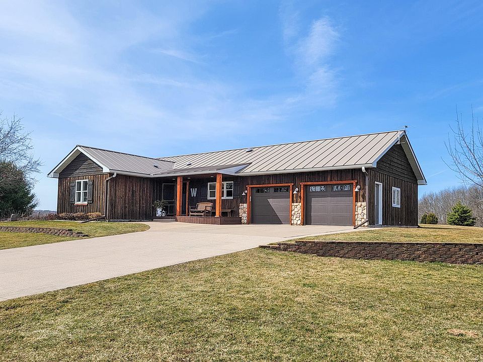 Here's the property you’ve been waiting for! Enjoy peaceful country living on approx. 20 mostly wooded acres (17A in MFL). This one-owner ranch home has a unique rustic appeal with barnwood siding, standing seam metal roof, 2 car heated garage, and a stone/wood pergola, stone firepit, and stamped concrete patio. Within the 30x56 pole shed, is an insulated 30x30 shop stubbed for heat & water, including a 4 post car lift. The open concept, split bedroom layout flows smoothly throughout the home from the cozy LR w/ the wood burning warm hearth fireplace to spacious dining area with great views to your backyard. The large rec room and office/den in the LL gives you an abundance of living space. This property hits the mark for location, beauty, and quality! See extensive list of improvements.