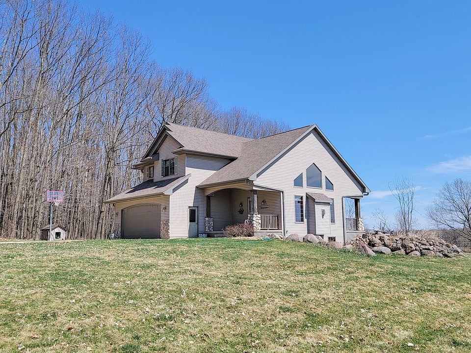 Enjoy peaceful country living with this custom built, one-owner home set back off the road. Situated on 3.27 acres, it has amazing panoramic views! Home features 3 BR, 2.2 baths, and 2 car att garage.The vaulted ceiling in the living room offers great natural light, oak hardwood floors, and a beautiful stone gas fireplace. The open concept dining and kitchen has a warm and cozy feel with access to the back covered porch and concrete patio with firepit. The laundry, bedrooms, including the primary ensuite are on the upper level. The lower level features a large family room, half bath, and great storage space. The additional heated, detached drive-thru garage (22x46) is ready for your storage and/or workspace. The newer barn/shed with loft (17x24) is set for your animals.*fiber internet @Rd