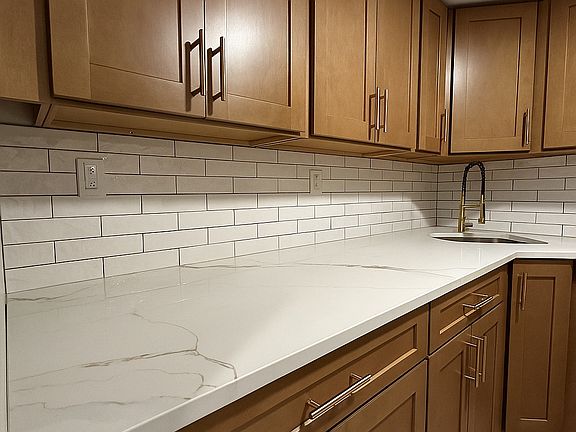 Gorgeous quartz countertops with premium cabinets and hardware.