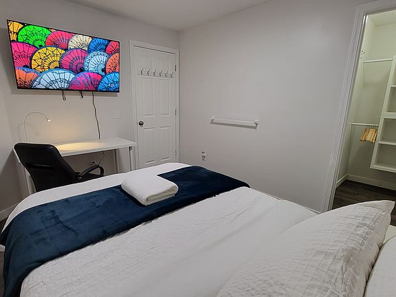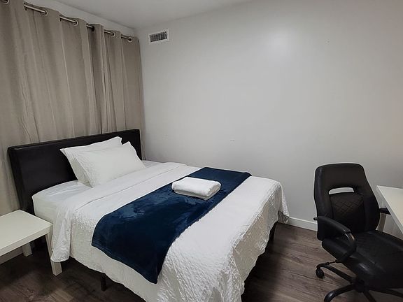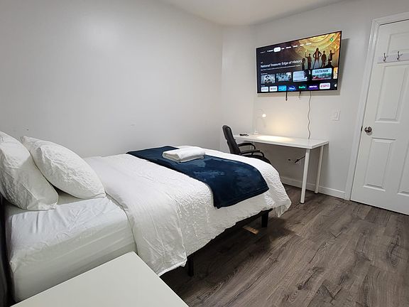 This private bedroom with a 10 sqft wardrobe and a view is a newly furnished full-size bed with a firm mattress. The room is provided with a blackout curtain, a working desk, and an ergonomic working chair. A 50" smart TV with a built-in Roku is also provided for your entertainment privacy.