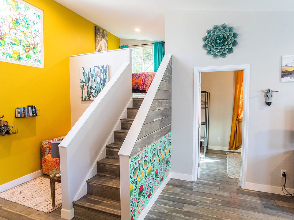 Private patioEclectic decorBright huesPrivate one-bedroom loftOpen airy feelVibrant space
