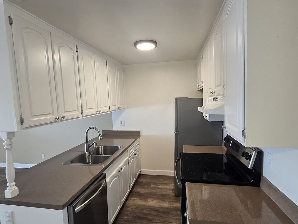 New wood-look plank flooring throughout, New kitchen cabinets, New Countertops, New Stainless Steel Refrigerator, New Stove, New Dishwasher, New Bathroom Vanity, Mirrored Bedroom closet doors.