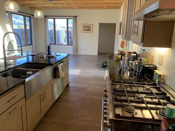 Located off Highway 150 to the Ski Valley, this spacious 3bd/2ba, 2300sf Pueblo style home on 1.3 acres and built in 2019, is bright and airy, private and quiet. With stunning views from nearly every room, you'll enjoy the warm New Mexico ambiance with vigas in the ceiling, a wood burning Kiva fireplace, radiant floor heat, and lots of beautiful tile work. The kitchen has an eat-in counter, granite counter tops and gas stove and range. The master bedroom has a door out to the rear portal and a huge walk-in closet, and the master bath has a soaking tub, dual sinks and a tile shower. Another bedroom also has a very large walk-in closet. The two car garage is heated and has an automatic door with remote. Enjoy the privacy of a small yard with an attractive latilla (aspen) fence, covered porch and the mountains so close you can almost touch them. For those with a green thumb, you'll enjoy the raised flower beds and seasonal fruit trees. This home is located in one of the most desirable Taos locations.