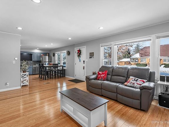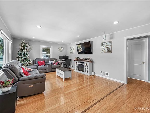 Spacious, move-in ready ranch home with a finished basement, large fenced yard, and outdoor entertaining space. This well-maintained home offers a bright open-concept main level featuring hardwood floors, recessed lighting, and large windows that provide abundant natural light throughout the living and dining areas. The updated kitchen showcases painted cabinetry, stainless steel appliances, tile backsplash, generous counter space, and an eat-in dining area. Neutral paint tones and clean finishes create a warm, modern feel across the main level. Main-level bedrooms are well-sized with newer carpeting, ceiling fans, ample closet space, and natural light. The updated full bathroom features a modern vanity, tiled flooring, and a tiled tub/shower surround. The finished basement adds excellent additional living space, including a large family/recreation room with recessed lighting, bonus rooms ideal for guests or home office use, a second bathroom area, and a dedicated laundry room with cabinetry and storage. An unfinished utility/storage area provides even more flexibility. Recent exterior improvements include a new roof, new gutters, and new window wraps, enhancing both curb appeal and peace of mind. Step outside to enjoy a wood deck, perfect for relaxing or entertaining, overlooking a fully fenced backyard with plenty of space for outdoor activities. The property also includes an attach two-car garage and a wide concrete driveway offering ample parking. Situated on a corner lot in a quiet residential neighborhood, this home shows pride of ownership and offers great indoor and outdoor living space.