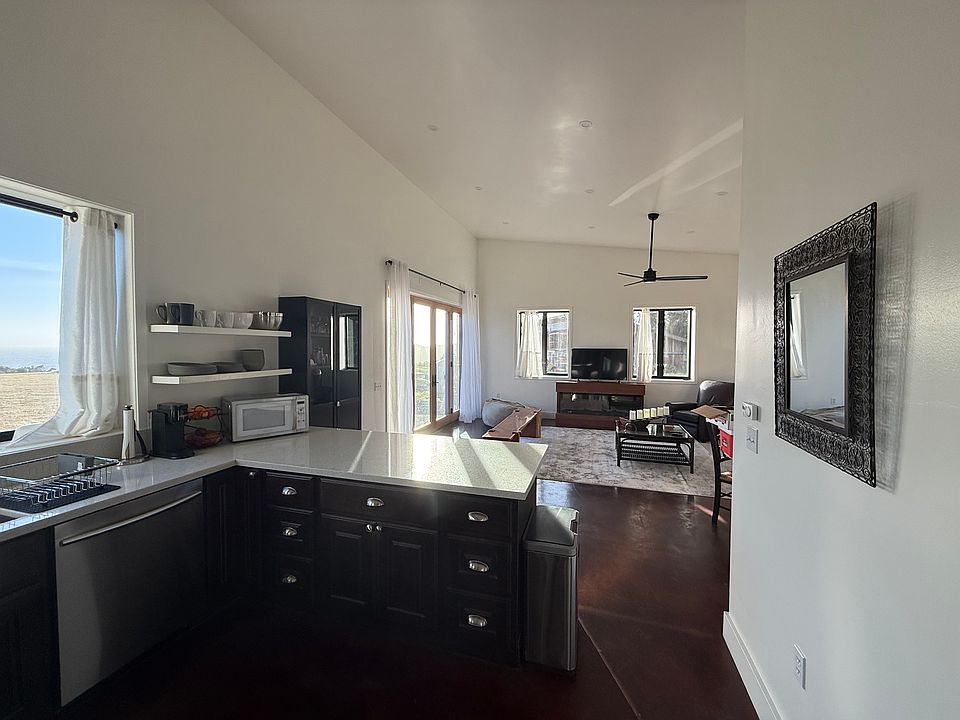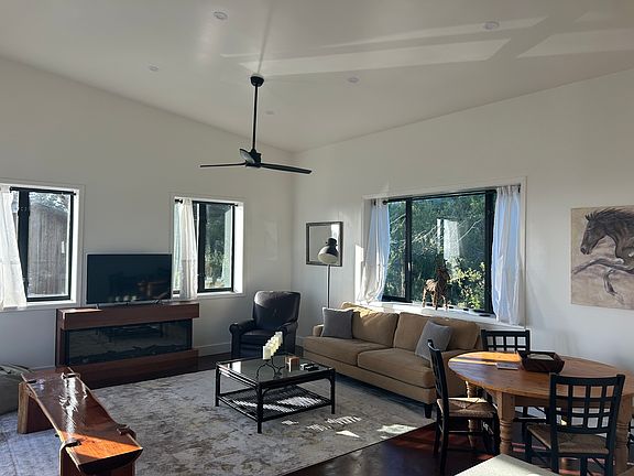 FULLY FURNISHED! This modern, spacious, light filled and ocean view home has extra high ceilings, recessed lighting, concrete floors with radiant heat, and open concept kitchen/living/dining. There is an electric fireplace in the living room, in addition to the radiant in-floor heating system. There is a new stacking washer/dryer in the bathroom. The kitchen is equipped with gas stove and cooktop, counter microwave, air fryer, coffee maker, dishwasher and large sink. The kitchen island has seating for four in addition to a dining table area. There are two bedrooms (primary bedroom - king bed, secondary bedroom - queen bed), each with a walk-in closet, and a closet organizing system installed in each for hanging and stacking items. Concrete outdoor patio with fire pit, and patio furniture. Gated access. Designated parking with two spaces adjacent to the house. Trash, internet and landscaping included in base rent. Electricity, gas, and water paid by tenant, based on metered usage. This house is located less than one mile from the town of Elk and Greenwood State Beach.