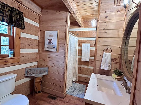Gorgeous true cabin that has been recently updated in desirable Coosawattee River Resort with 3 pools and rec center with tennis courts, mini golf and workout room. Close to many wineries, whitewater rafting, state parks, mountain bike trails, hiking, great restaurants and more! Each level in house has its own tv area and bathroom. Deer everywhere you look! Fire pit table in the back deck. Rocking chairs and swing in front porch. Short term rental of 31 days at a time.