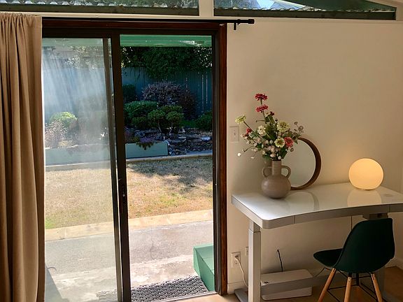 Sliding glass door to backyard garden with redwood views