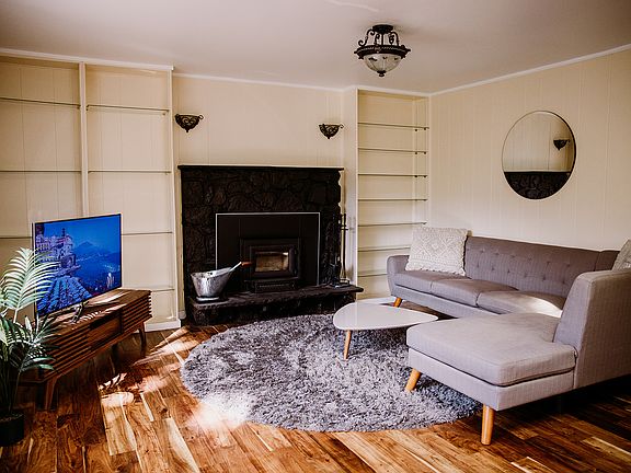 Mid-century modern-style living room with insert fireplace; bedrooms feature space for queen size beds, ceiling fans and hardwood floors. Equipped kitchen with a gas range and full size fridge. Remodeled bathroom with Kohler features.