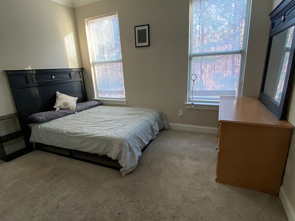 Furnished private bedroom featuring a king sized bed is available on the kitchen-level floor of a well-maintained 7-bedroom home. This room is ideal for a single occupant seeking convenience and privacy. Tenant has access to a shared full bathroom (share with 1), shared kitchen, in-home washer and dryer, and driveway parking.