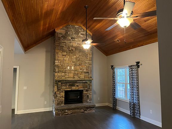 3BR 2B on 2.16 Acres. Approximately 1800sqft. Has kitchen, living room with vaulted wood ceiling, floor to ceiling rock fireplace, laundry room, dining area, front and back porch area. Central heating & air. Interior floors have been recently refinished and interior was recently painted as well.