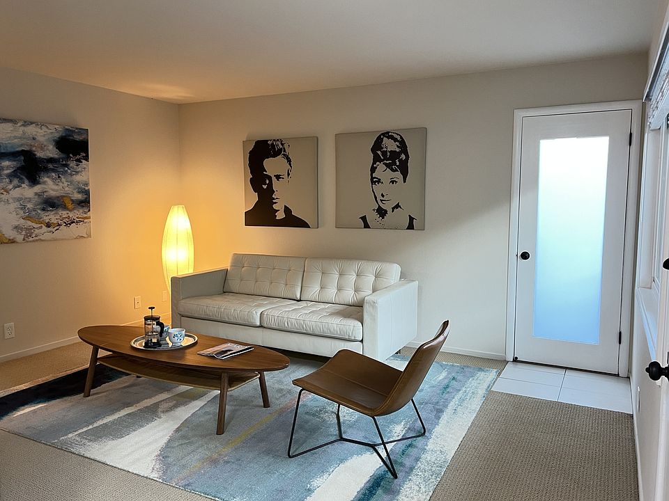 Mid Century Modern in Fairfax! 1/2 month free rent with a 1 year lease. Must begin lease by November 18th or sooner. Remodeled kitchen with new White shaker style cabinets,Calacatta white quartz counter tops and white subway tile! New modern LED lighting, newer GE stove and stainless refrigerator,and brand new contemporary berber style carpet. Dining area with views of courtyard and pool! Brand new modern 12x 24" white porcelain tile in kitchen. This top floor, corner unit has 1 bedroom/1 bath which has been remodeled new vanity and Hans Grohe faucet and low flow Toto toilet. Enjoy original multi color tile in bath and refinished bath tub too. White 2" window blinds thru out. This apartment has a nice open floor plan with 2 large closets too!