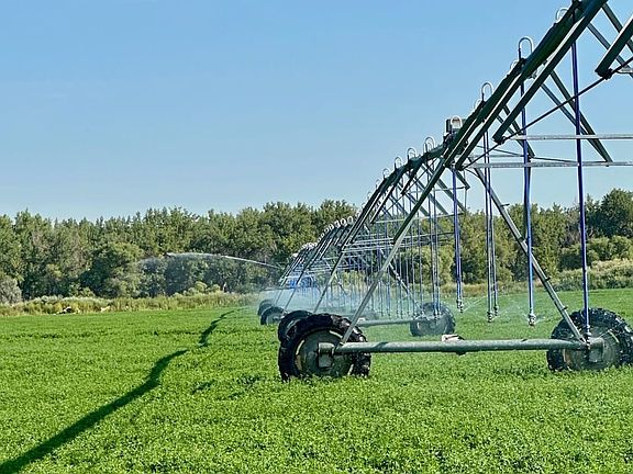 Faith Farm holds valuable water rights, which irrigate approximately 50 acres of alfalfa under a center pivot. In an average year, the irrigated land consistently produces over four tons of hay per acre, making it a reliable contributor to the property's agricultural value.