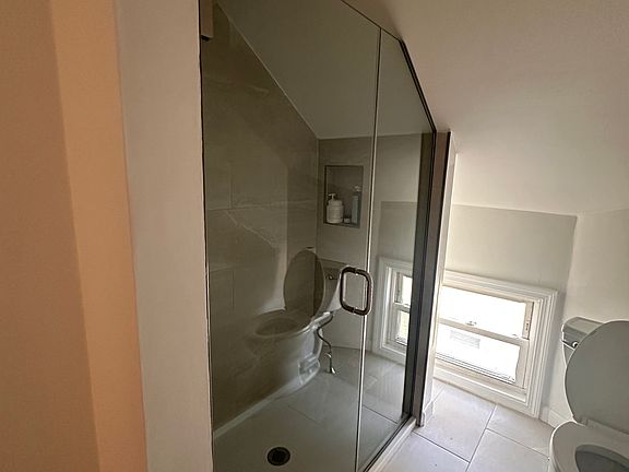- A renovated bathroom with a glass-enclosed rain shower