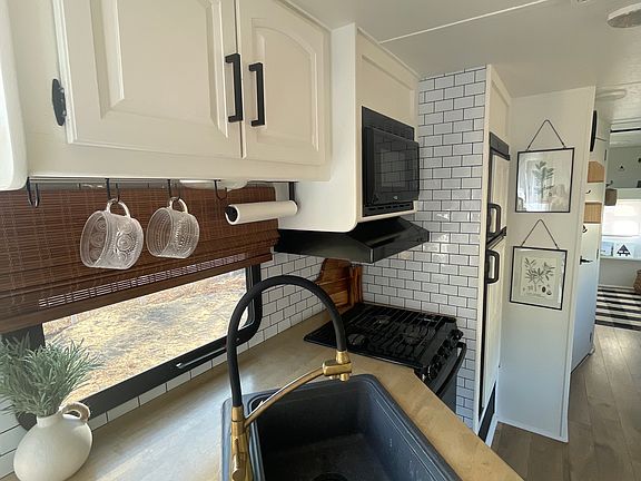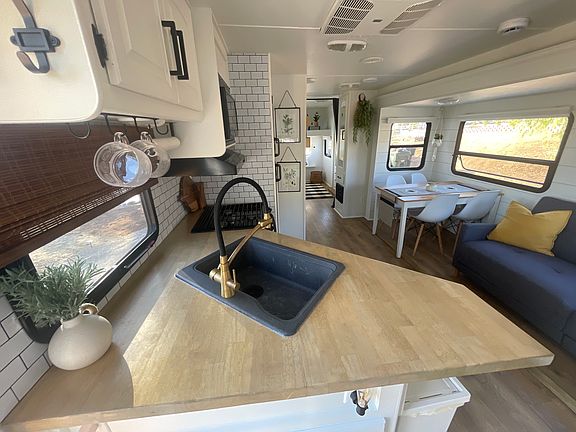 Welcome to the Golden Sunset Getaway; your newly renovated tiny home in the quiet countryside on a private property. Enjoy the views in this 2 bedroom which includes one queen bed w/ closet space & the 2nd room can be used as a home office or bedroom; offers large office desk space, overhead storage shelf and bunk bed. Home comes fully furnished with fresh bedding, full kitchen stocked, roku, wifi and tv. This travel trailer has considerable closet and storage space for all your needs. Due to the septic system, only 2 adults will be permitted to occupy.
