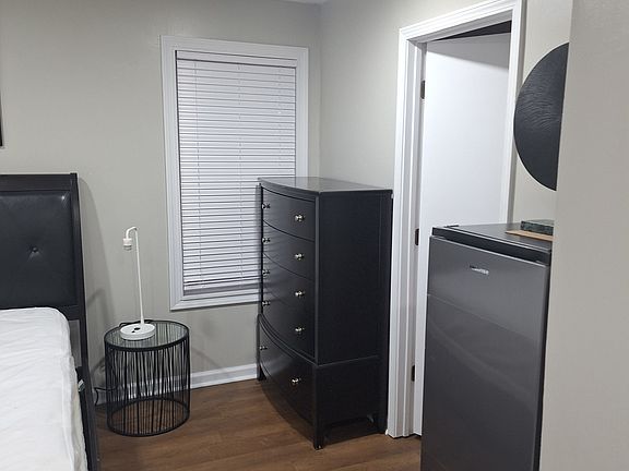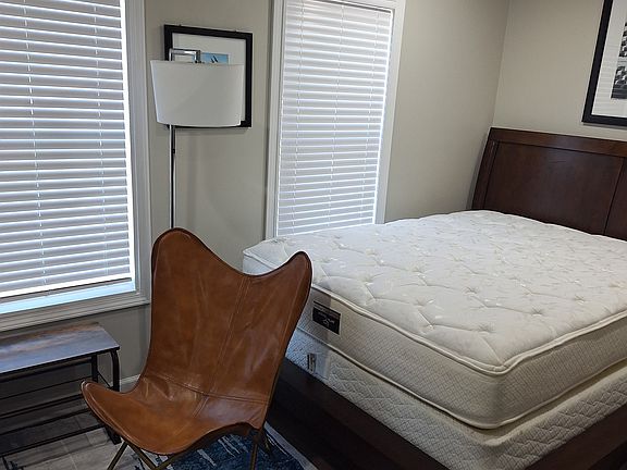 This room was once a den. This room has a queen size bed, a full size mirror on the wall, a nightstand with lamp, a mini split unit that provides heat and ac, a dresser, a closet, a refrigerator and a bathroom with a tile shower, vanity, and storage over the toliet. The room also has a a small chair and bedside table with a reading lamp.