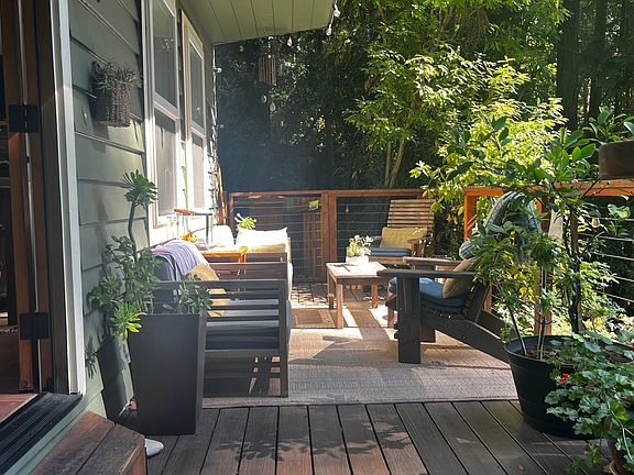 This tri-level home has a large front paved patio leading to the trex deck equipped with lounge sofa and chairs perfect for reading a book or a lazy nap. The French door entry into the house has an inviting foyer with custom saltillo tile flooring. The living room provides a cozy wood-burning, modern fireplace in and flows into a game area equipped with a pool table, dart board and multiple cozy seating areas. White-stained Oak hardwood flooring add lightness and charm, French doors on other end lead to a large deck that holds a Ping Pong table and an outdoor breakfast table.