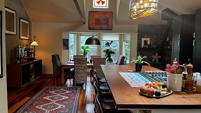 Upstairs there is a modern kitchen with charcoal Thomasville cabinets and Moroccan black/white tiles as a backsplash and along entire wall - dramatic. Bosch stainless appliances, a coffee station, and an oversized teak island with seating for six, includes Bosch cooktop and oven. Built-in microwave is a dual convection oven/microwave. Beautiful, aged pine floors accentuate and warm the space. Above are exposed oak beams and two skylights. Above the sink is an oversized window that opens up to an outdoor bar dining and BBQ trex deck area. Perfect for bringing the outside air in. Next to the gourmet kitchen is a dining area with a rustic pine dining table with a wood-burning fireplace in the corner to keep you extra warm in the winter. A charming guest bath finish off this level.
