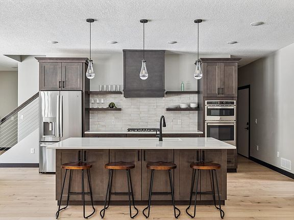 Open concept designCedar shakesStriking black-on-black marvin windowsDouble sinksStunning kitchenBeautiful quartz countertopsSide entry