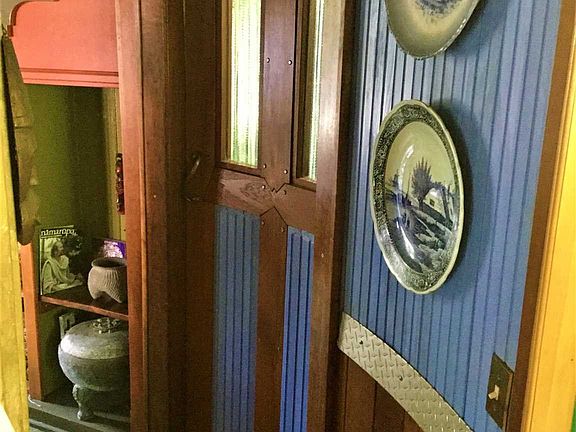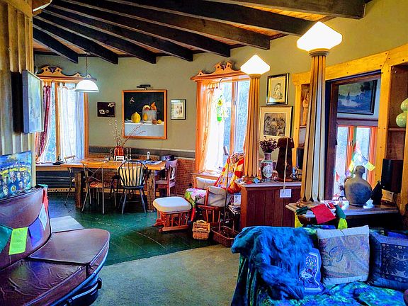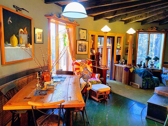 Located at the base of the Catskill Mountains in the historic Woodstock area is this one of a kind, hand-built circlet masterpiece that seems to rise out of the ground like an obelisk in perfect harmony. Built by world-renowned artist, John Kahn, who was an associate of Jim Henson. Together they designed sets and costumes for the Muppets and Fraggle Rock. The attention to detail and design will give you a look inside the mind of this great artist. Let your imagination run wild and bring out your inner child. You will feel secluded from the world and connected with nature. Shopping, dining, and activities are less than 10 minutes away in Woodstock. The main house is a functional sculpture. Each inch of this house was hand-made with the finest quality of materials available including walnut, copper, and bamboo. This is something you might find in a museum. To quote the current owner'I live in a sculpture! Even the paint is of unusual tones. The main house consists of 5 floors, 2118 sq ft, grand staircase, upscale kitchen with custom cabinets with copper inserts, arched pocket door, and a fifth-floor wrap around porch that will let you take advantage of the amazing sunsets over the Catskills. The 5 acre property also consist of several other sculptures and outbuilding including a Swedish sauna, a two-room studio and is surrounded with joyful gardens, terraces and taste full landscaping. Don't miss out on this Spiritual retreat where the vibe is positive, and the mood is chill..