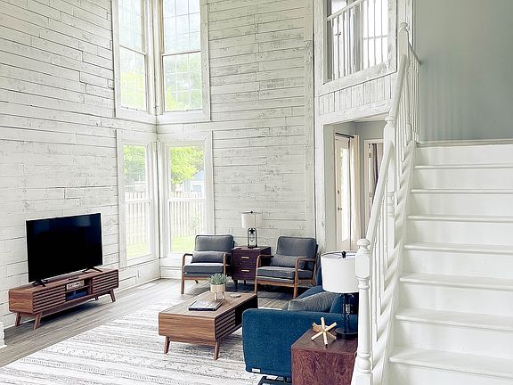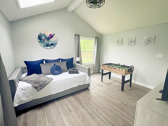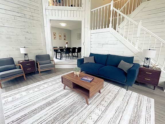 This two-story home features a bright, open living area with high ceilings, Smart TV, decorative fireplace, and foosball table. The fully equipped kitchen includes stainless appliances, Keurig and French press, cookware, and dining space for 8+ guests. A dedicated workspace with desk and monitor makes working from home easy, plus high-speed Wi-Fi throughout.