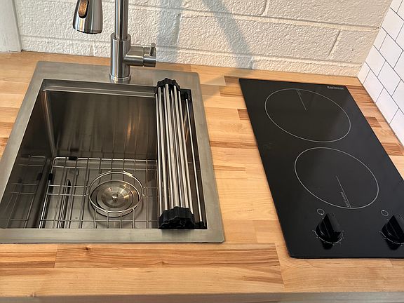 This new addition off of the main house with it's own private entrance features a kitchenette with a pull-down faucet and deep stainless steel sink with accessories; drying rack, cutting board. Electric glass cook-top and spacious refrigerator. Large bedroom/living area and full sized bathroom with luxurious walk-in tiled shower. Plenty of storage space. One previous tenant. Washer and dryer on site.