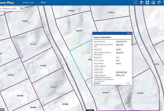 FLEMING DR SEQUIM, WA 98382 Almost 1/2 acre, (.47acre) near the street, waiting for a home to be built on. ( The property is next to 170 Fleming Dr.) It is a wooded area. Annually, $50 HOA due