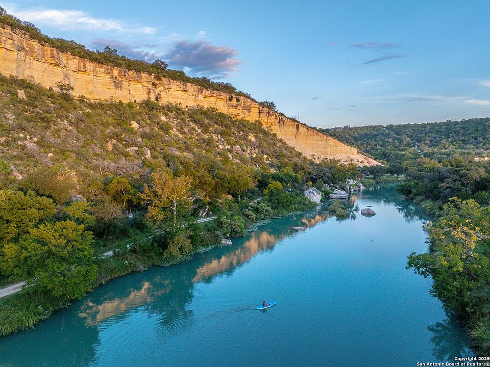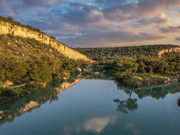 Boulder Creek Ranch encompasses 309 acres in the heart of Kimble County, offering live water, dramatic terrain, and a main ranch house set high above the Johnson Fork. Located about 10 miles southeast of Junction and only a mile off Interstate 10, the ranch provides both accessibility and privacy, with the outer rim of San Antonio just over an hour away. The property is anchored by more than 2,500 feet of frontage along the Johnson Fork Creek. This stretch of water is recognized for its deep blue color and clarity, reaching depths of 10 feet and spanning more than 100 feet across in places. Limestone and chalk bluffs rise over 200 feet above the creek, creating a dramatic contrast between the bright river valley and the rugged high country above. The water supports year-round recreation, from swimming and kayaking to fishing and simply enjoying shaded areas along the banks. The terrain climbs quickly away from the creek, breaking into canyons, ridges, and rolling uplands that connect into the Blue Mountains. From the higher elevations, long views stretch for miles across the Hill Country, capturing both sunrise and sunset. The land possesses great native habitat for thriving wildlife, with whitetail, axis, and turkey calling the ranch home. The main home sits atop one of the ranch's most prominent ridgelines, a 3,000 square foot residence with four bedrooms and two and a half bathrooms. Warm wood finishes, vaulted ceilings, and an open layout create a welcoming interior. The upstairs bedrooms overlook the great room below, and the wide porch frames views of the Johnson Fork and the valley directly beneath. A detached two-car garage and a two-car carport enclosed on three sides provide covered parking and storage. A 591 square foot river cabin offers additional lodging near the water, with one bedroom, one bathroom, and a covered porch. This cabin serves well as a guest house or as a hunter's cabin for extended stays. Two water wells supply the property, supporting household and ranch use. A network of internal roads extends throughout the property, with the main road paved all the way to the hilltop residence and additional trails providing access to the creek, canyons, and elevated vantage points. Boulder Creek Ranch reflects the best of the region's character: clear live water, towering bluffs, and wide-open views across the Hill Country. Its combination of improvements, live water frontage, and size make it well suited for recreation, hunting, or a long-term residence within easy reach of Junction, San Antonio, and Kerrville.