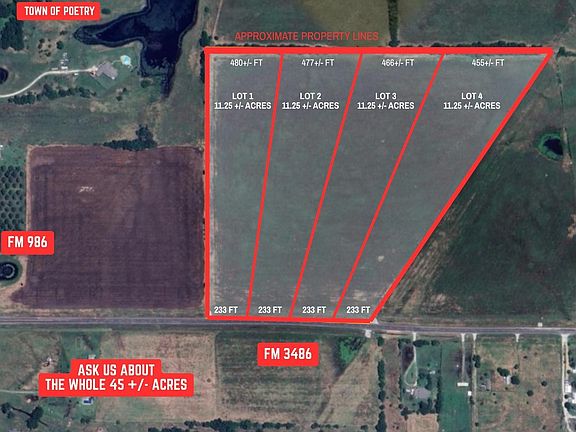 Rare opportunity to own 11.28 (+ or -) acre lot to build out your forever ranchette. There are 4 to choose from and located in the Poetry area which has developed into a sought after community half way between I 30 and I 20 convienent for commuters or trips to the airport. These lots were thought out and divided with care to include a house and 1 acre plus 10 for an agricultural use if desired. The property is currently under hay production. The sellers have already surveyed out 4 large lots to choose from and water, electric are available at the road for each lot. We have included a virtual example of what your vision might look like on lots 1-4. Now is the time to make it yours, call for more information. Septic required for each lot bring your builder take a look! Photos with homes and buildings have been virtually displayed and do not exist to easier visualize the properties possibilities.