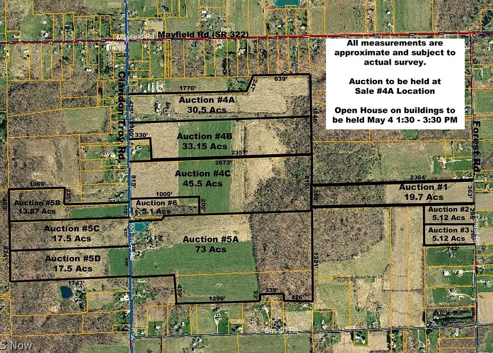 Absolute auction, all sells to the highest bidder on location: SATURDAY – MAY 10, 2014 – 10:30 AM Rajki Farms – Family Owned Since 1933 265 Acres – Two Farms – Seven Homes – Beautiful Land – Sugar Woods – 2 1/2% & 4% Seller Financing Claridon Twp – Geauga County, Ohio All Mineral Rights to Transfer – Offered in Parcels TERMS ON REAL ESTATE: 10% down auction day, balance due at closing or seller will finance. Buyer's premium of 10% to be added to the final bid to establish the purchase price or seller will finance on any parcel or combination, total 20% down, 2 1/2% interest, 6 yr amortization; or 4% with 10 year amortization, secured by note and 1st mortgage. No early payoff. Call Rusty for details. Any desired inspections must be made prior to bidding. All information contained herein was derived from sources believed to be correct.