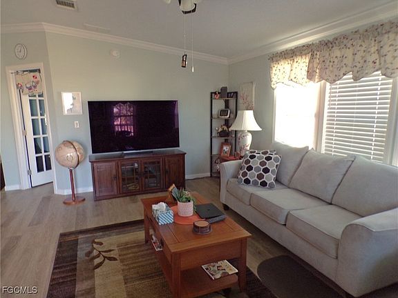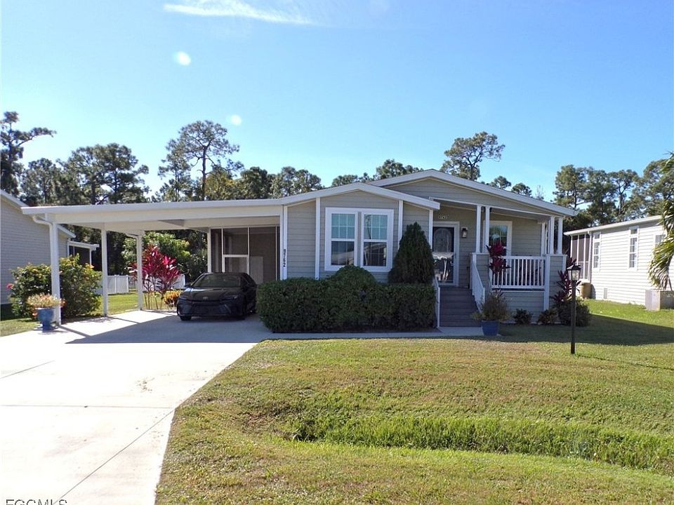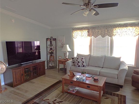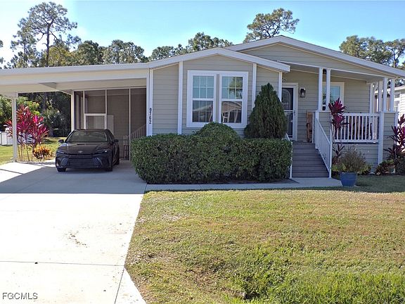 Step into this well maintained, newer, 2019 home in the desirable 55+ community of Country Lakes. Situated on your own spacious private lot with a peaceful wooded backdrop, this residence offers a warm and inviting great-room layout with 2 bedrooms, a study, 2 full baths and 1445 Sq Feet. . Bright and airy with vaulted ceilings, the home features an upgraded island kitchen with stainless steel appliances and quality cabinetry. Both bathrooms, flooring, and windows have been updated as well. Enjoy the comfort of a screened lanai and the convenience of a spacious attached storage shed.