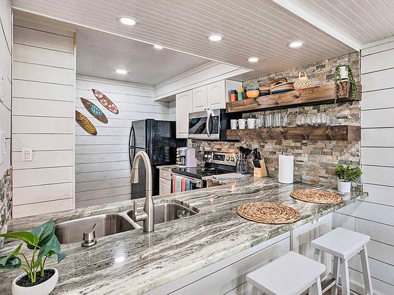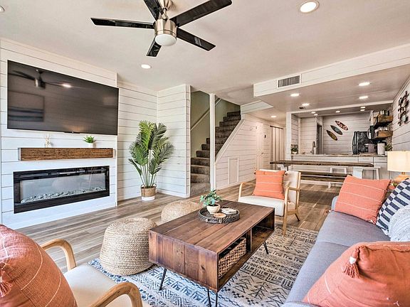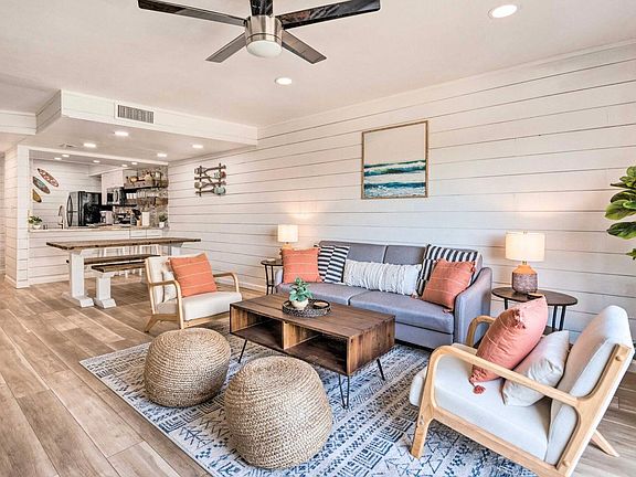This fully furnished 2-bedroom, 2.5-bathroom condo features modern finishes, a full kitchen, and all the comforts of home. Spend your days relaxing on the beach, which is just a short walk away (2-3 mins). This condo is also close to local eateries, beach shops and more. This 1200 square foot condo also offers smart TVs, electric fireplace, washer/dryer, new luxury floors, spa shower, beach decor and a private balcony.