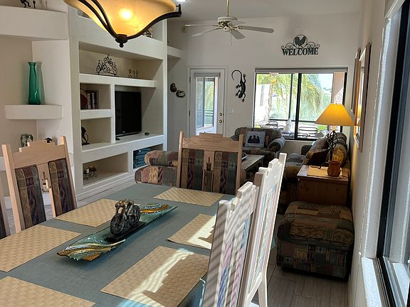 Fully furnished, Southwestern decor., Single level-No Interior Steps, Wheelchair accessible, New Tile Flooring throughout, One car garage, Ceiling Fans; Central Air, Washer/Dryer, Screened in Patio, Very Clean. Within walking distance to Fountain Park, grocery store, shopping. Master bedroom with King size bed, Large walk-in closet. 2nd bedroom has Queen size bed with Roku TV. 2nd bath has walk-in shower. Washer/Dryer, Kitchen is fully furnished.