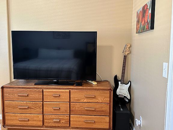 The large master bedroom suite is furnished with a king size bed, 2 dressers, small refrigerator, 65" Big Screen TV in Bedroom, mini split, high speed wireless internet and a walk-in closet. Bedroom with lock. Private Bathroom inside Private Bedroom, Modern & Clean. Dedicate workspace with desk & chair in the bedroom. Provided Bed Linens, Pillows, Comforter.