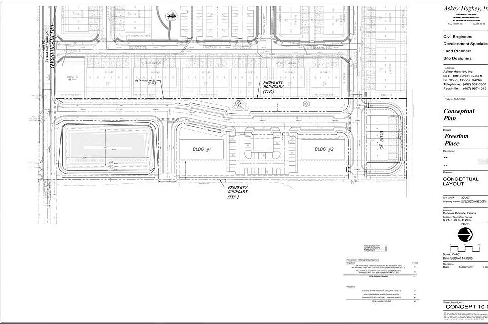 New apartment configuration planned for 36 units! New pricing being contemplated. Site Development Plan approved by Osceola County, engineering CAD plans available, SFWMD ERP issued. Water and sewer extended down Freedom Rd, no lift station or force main required for sanitary. Engineering, soil tests, environmental tests completed and available. Located off highly desirable Ham Brown Rd. Freedom Road upgraded with curbs, gutters, and sidewalks. Existing structures being demo’d. Elevation is representative conceptual for SDP submission.