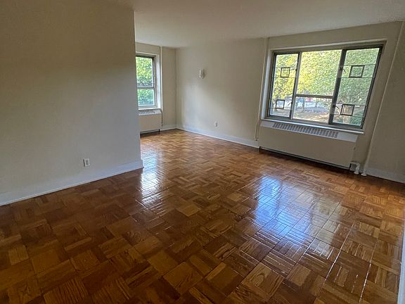 This studio apartment for rent is located on the second floor of a three-story walk-up building. It features an L shaped layout with a separate kitchen, two spacious closets, and a newly renovated bathroom.