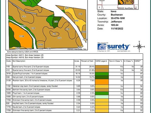 There are 91.65 acres enrolled in a CP-42 contract that pays $297.97/acre - or $27,309.00 annually - and expires September 30, 2026. There are 10.64 acres enrolled in a CP-88 contract that pays $41.65/acre - or $443.00 annually - and expires September 30, 2036. There are 2.33 acres enrolled in a CP-8A contract that pays $387.60/acre - or $903.00 annually - and expires September 30, 2025. Buyer to receive 100% of the October 1, 2023 CRP payments. The CRP on this farm is enrolled in the Iowa Habitat & Access Program (IHAP). This program allows for annual, public hunting from September 1 to May 31. Local DNR officers will monitor the hunting activity.