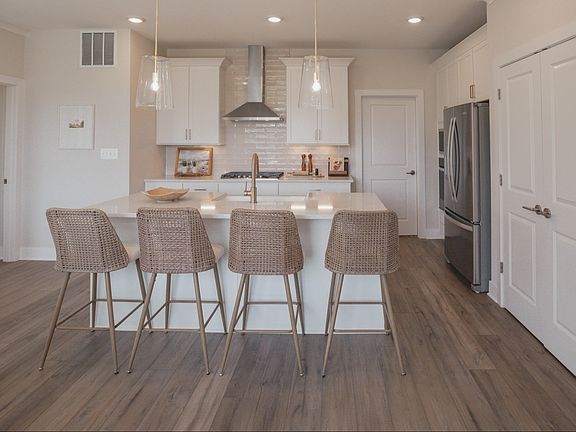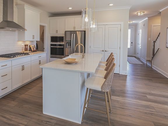 End of Row, 2 Level Townhome with 4th Bedroom and Electric Fireplace! End of row, beauty unlike any other! This stunning exterior homesite offers a private balcony backing to a wooded backdrop, plus a welcoming front porch overlooking the beautiful Silver Woods community. Inside, you'll find a chef's kitchen with vent hood, GE stainless steel appliances, gray cabinetry, upgraded luxury vinyl plank flooring, custom backsplash, farmhouse-style white sink, laundry room cabinets, and a tile laundry room floor. Designer lighting, under-cabinet lighting, recessed lighting, and ceiling fan prewires add both style and function. Enjoy the convenience of a two-car garage, spacious bedrooms, and an primary suite on the first floor. Upstairs is a true guest paradise, featuring three additional bedrooms, two full bathrooms, a large deck with wooded views, a front balcony, and hardwood stairs. With upgraded, model-like finishes throughout, this undecorated model is move-in ready to showcase your personal style. A rare combination of luxury, comfort, and privacy-don't miss the opportunity to make it yours!