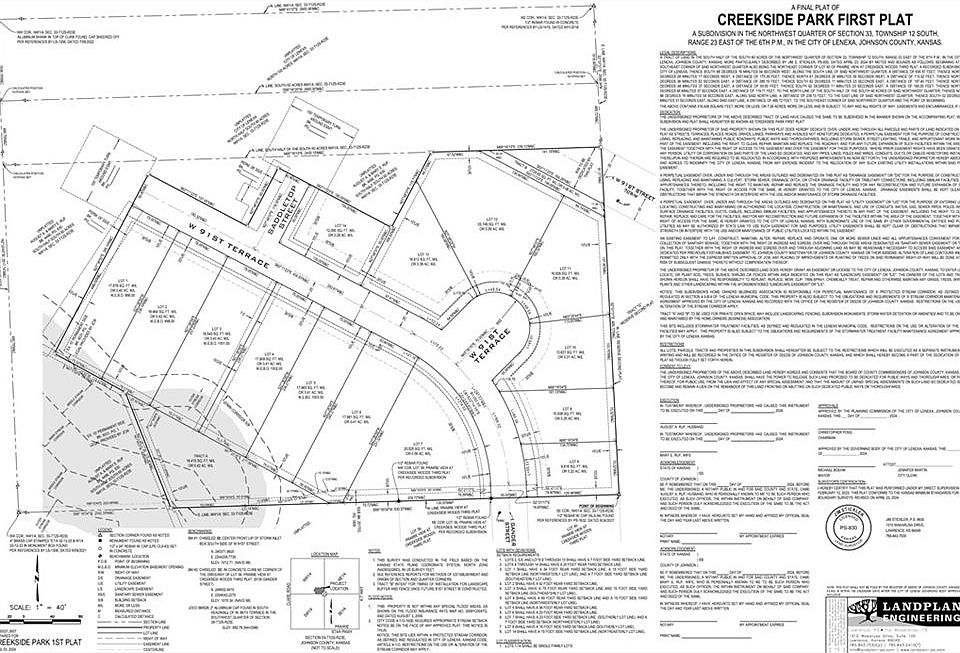Unique development land opportunity in an incredible Lenexa location! 7.26 acres ready to be developed as Creekside Park 1st Plat, connecting to the popular Creekside Woods development. Beautiful topography slated for 14 large lots: some over half an acre and several backing to beautiful existing treeline. This would be the first of three potential phases of Creekside Park subdivision. Project has been approved by city planning commission and plat is ready to be recorded. A rare and fantastic opportunity!