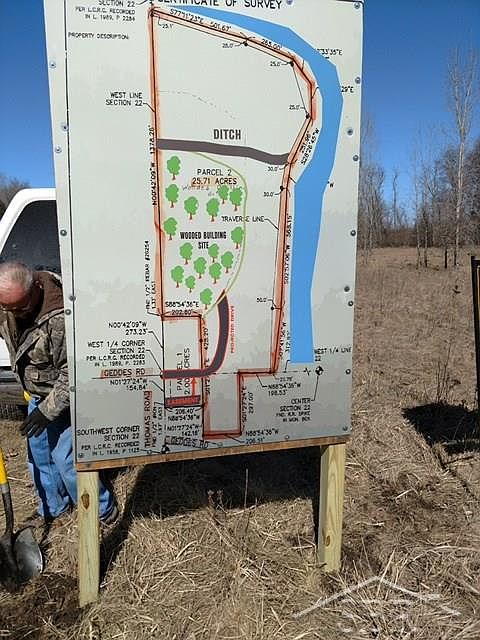 25 acres in Thomas Twp. Beautiful building sites, , standing pines, partially wooded, borders along the Swan Creek, also including aprrox 17 acres of farmland. Great for hunting and recreational activities. city gas and water available at road. Great potential for development.NEW REDUCED PRICED.