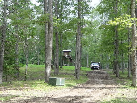 Great 21 wooded acres with wet weather creek. Joins Tennessee Wildlife Resource Area at back of property. Tree stand is steel framed and concrete with metal flooring. 3 bdrm septic system, underground utilities, 1 bdrm house with living room, kitchen and bath, heat & air wall unit. Chow house with water and electric. Abundant wildlife. Approx. 500' road frontage.