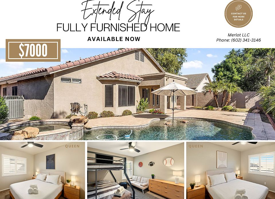 Welcome to your fully furnished, pet-friendly home in Gilbert AZ ideal for travel nurses, temporary housing agencies, remote workers, or anyone seeking an extended stay from fall through winter.