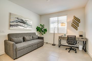 Experience the essence of the Valley of the Sun at this modern Glendale vacation rental and corporate housing. Located in the West Valley, this newly built 3-bedroom, 2-bathroom home offers plenty of natural light, a fenced yard with a patio, and easy access to nearby hospitals like Banner Thunderbird Medical Center, Abrazo Arrowhead Campus, and HonorHealth Deer Valley Medical Center. Inside, discover a spacious layout where two bedrooms share a full bath, while the third bedroom boasts its own private bathroom. Each room sleeps 2 comfortably with queen beds and ample storage, ensuring a restful stay.