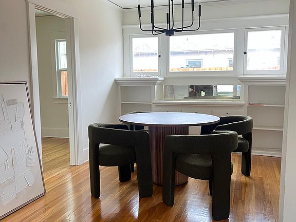 An adorable California Bungalow that exudes character and charm. Light and airy living room, where newly refinished hardwood floors shine Picture yourself hosting gatherings in the adjacent dining room, complete with built-in shelving that's perfect for showcasing your favorite pieces. decorative fireplace beckons. Picture yourself hosting gatherings in the adjacent dining room, complete with built-in shelving that's perfect for showcasing your favorite pieces. The kitchen boasts freshly painted white cabinetry and a cozy breakfast nook that invites morning conversations over coffee.