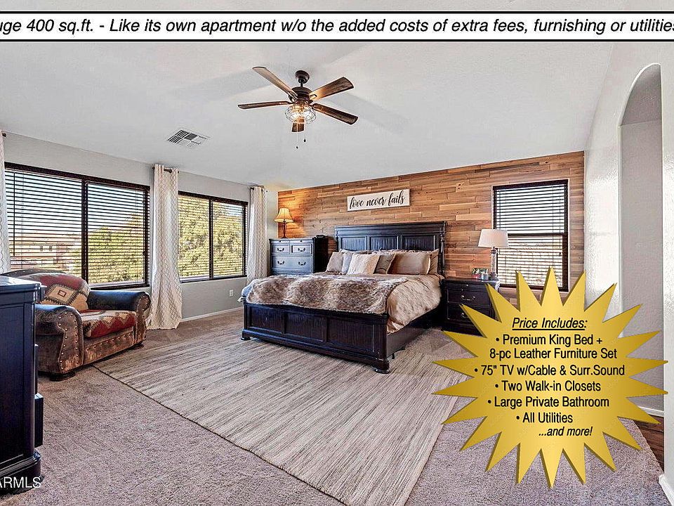 Huge master suite of total 400 ft. incl. private en suite bath with separate tub & shower, two walk-in closets and 8-piece brand-new premium espresso leather king bedroom set and your own new personal fridge. Almost like having an apartment except without the long-term lease or associated costs of extra fees, utilities and furniture!