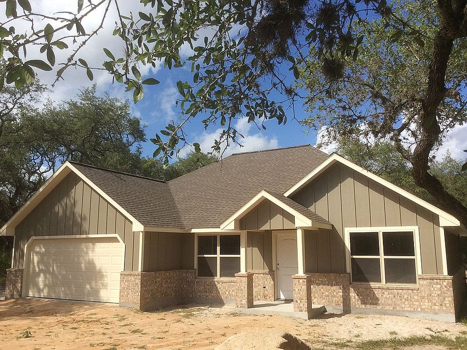 This beautiful new home sits on a 1/2 acre wooded lot. Located in Victoria County near Coleto Creek State Park. Also near Goliad county for a second option of school districts. It is a 3 bed, 2 bath, 2 car garage home. Features: split bedroom design, raised ceiling, carpet/ vinyl plank flooring, granite counter tops, patio w/ pergola, brick and vertical hardy veneer. No city taxes or water/ sewer bill. Option to buy adjacent lot for shop or more privacy.