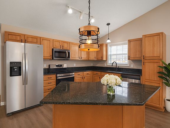 Modern light fixturesOpen concept kitchenUpdated bathroomsStainless steel appliancesVaulted ceilingFresh paintFenced private backyard
