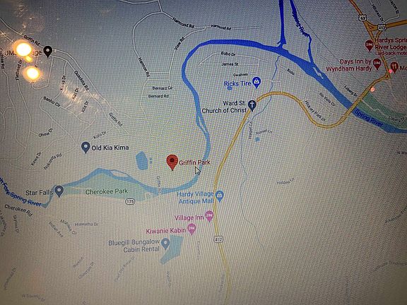 Water front property in Arkansas. Vacant lot for sale, Fishing on Spring River in north central Arkansas, inside Griffin Park, Hardy, AR. This vacant lot boasts 52 feet of river frontage on the beautiful and clear Spring River, with electricity and rural water very close by. The lot is marked off, and has 50.36 feet along the road. Excellent fishing here from this lot on a good deep hole in the Spring River. Located inside Griffin Park campground near Hardy, AR close to where Hwy 62 meets Hwy 175 South. The survey of this lot is on file, and it is marked off with orange tape onsite. Turn onto Griffin Road and go down to the end, where Lot E (lot 5) is marked off. This spot has plenty of room for your RV, camper, or family tent campground. There is no known restrictions. You can enjoy the small charming antique stores and craft shops in the towns of Cherokee Village and Hardy, Arkansas. To make an appointment to see this neat recreational, fishing, camping, floating spot, call "Coach" Ron Guess, Pocahontas Real Estate Co.